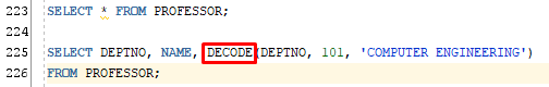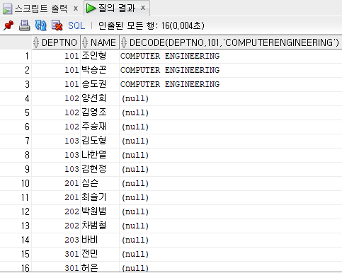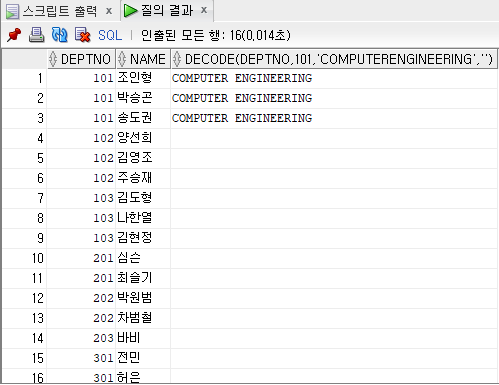 SELECT DEPTNO, NAME, DECODE(DEPTNO, 101, 'COMPUTER ENGINEERING', 'ETC') DNAME