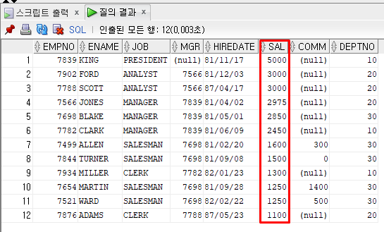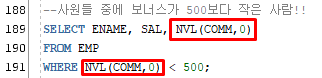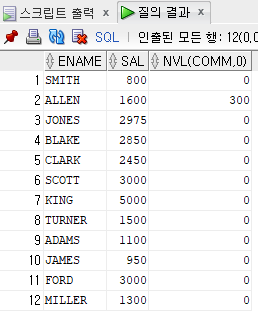 NVL(SAL, 0) -> SAL 컬럼의 값이 NULL일 경우 NULL대신 0으로!