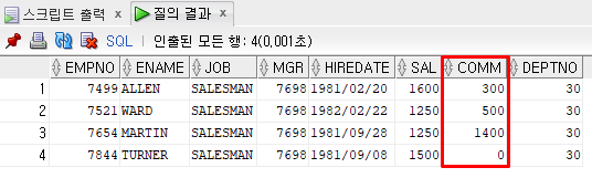 NVL(SAL, 100) -> SAL 컬럼의 값이 NULL일 경우 NULL대신 100으로!