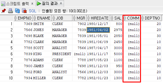 NVL(SAL, 0) -> SAL 컬럼의 값이 NULL일 경우 NULL대신 0으로!