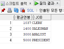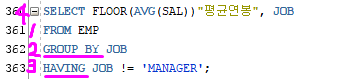 예) EMP에서 JOB별로 그룹만드는데 직업 중 MANAGER 말고 나머지 행들의 평균 연봉과 직업을 보여주세요!