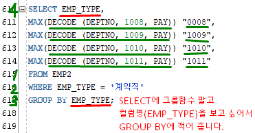 SELECT 그룹함수 말고 다른 컬렴명쓰고 싶으면 GROUP BY 그 컬럼명을 적어줘야 함!