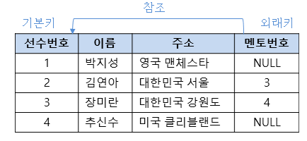 외례키 : 자기 자신의 기본키를 참조하여 외례키도 가능함.