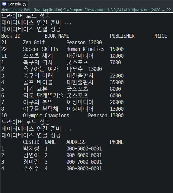 아래 예제는 1. 변수, 2. 배열, 3. 객체, 4. 객체배열 방법으로 Book table과 1. 변수, 4. 객체배열 방법으로 Customer table 을 가져와서 출력해보았어요!