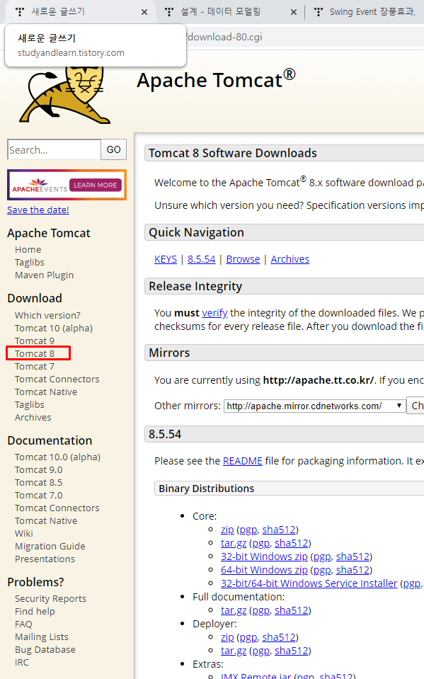 "아파치 톰켓" 구글하면 영어 사이트 나옵니다.