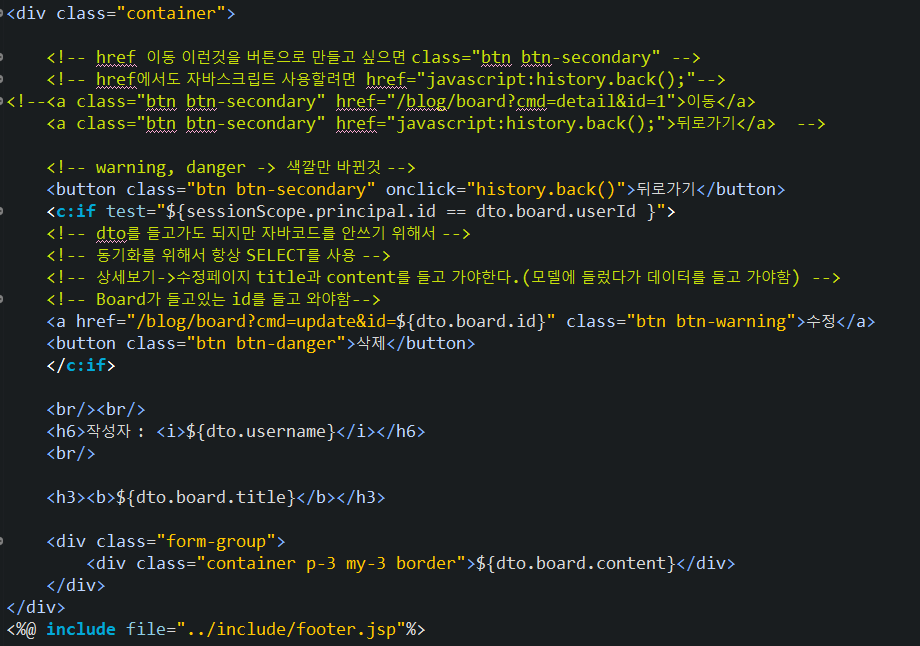 detail.jsp에서 principal은 user 오브젝트다. 왜냐하면 UsersLoginProcAction에서 session에 담아놨기 때문에 담아놨다.