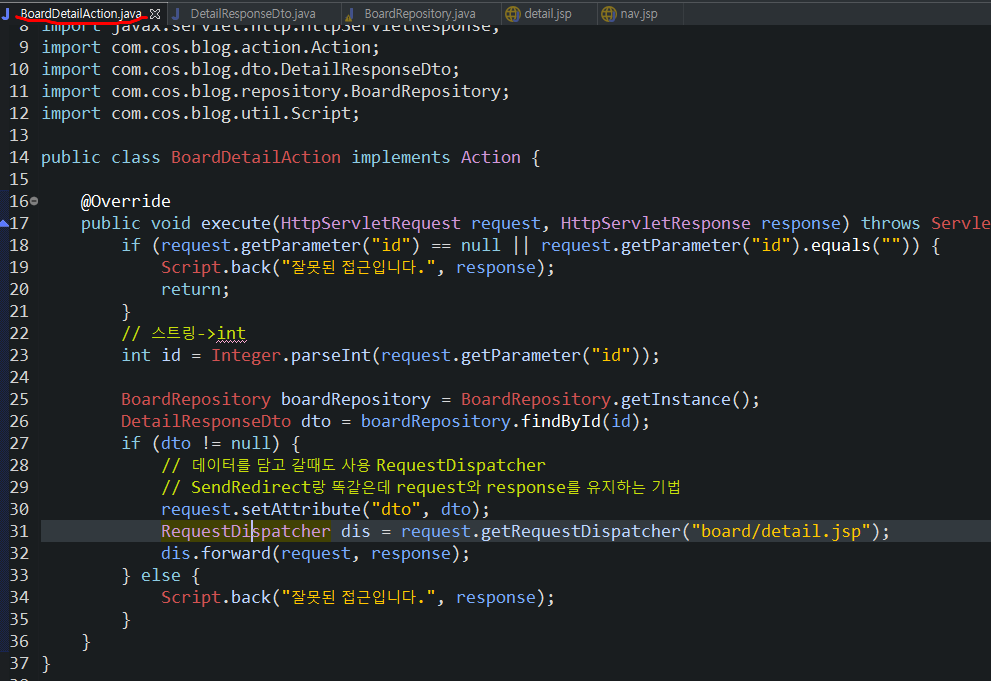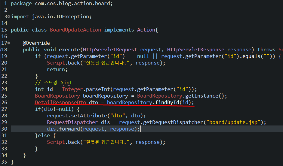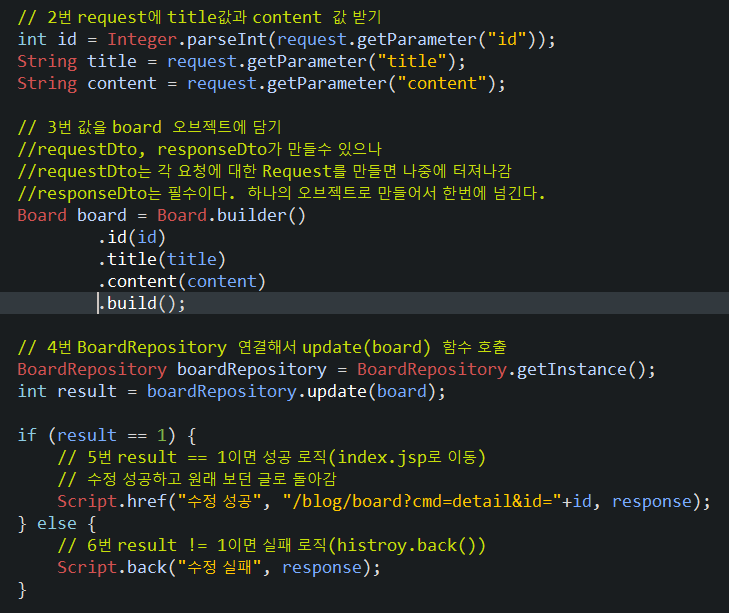 dto 를 update.jsp 가기전에 request에 담아서 간다.