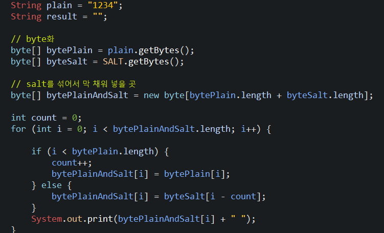비밀번호+SALT로 (레인보우 테이블을 막기위해서) 만큼 배열을 선언한다.
