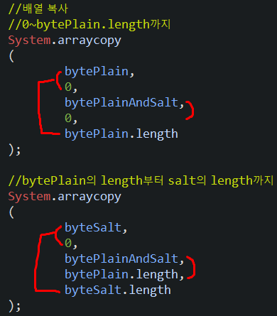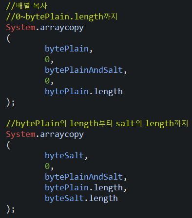 bytePlainAndSalt의 bytePlain.length부터 bytePlain.length까지 복사