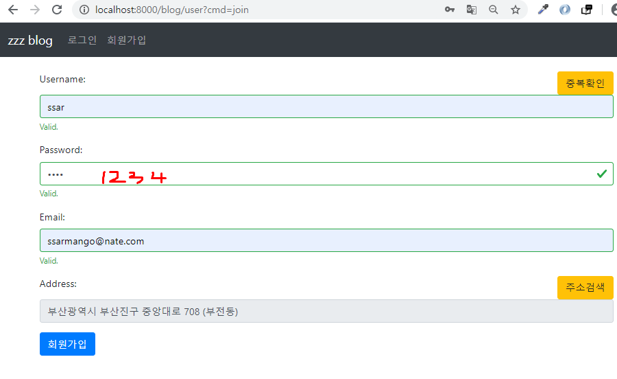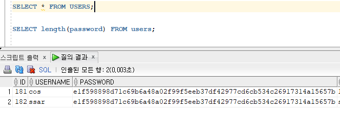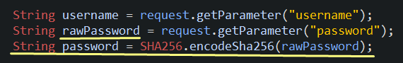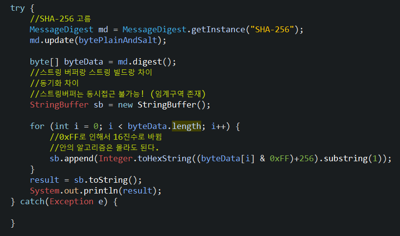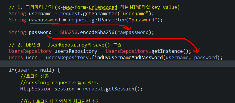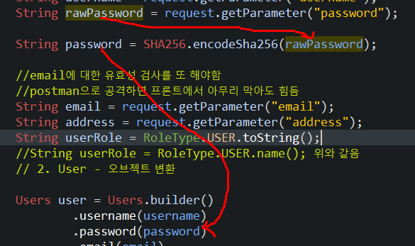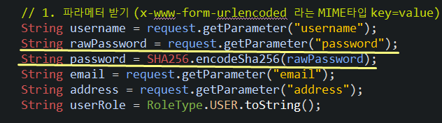 만들어둔 SHA256.encodeSha256을 이용해서 비밀번호를 해쉬화 함