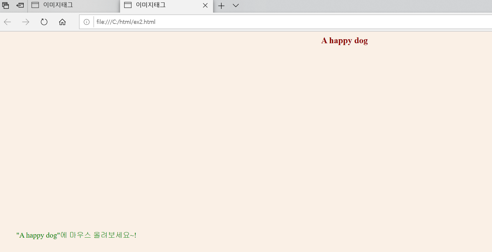 </script> </head> <body> <h3 onmouseover="show()" onmouseout="hide()">A happy dog</h3> "A happy dog"에 마우스 올려보세요~! <img width ="500" height ="400" id="dog" src=""> </body> </html> |