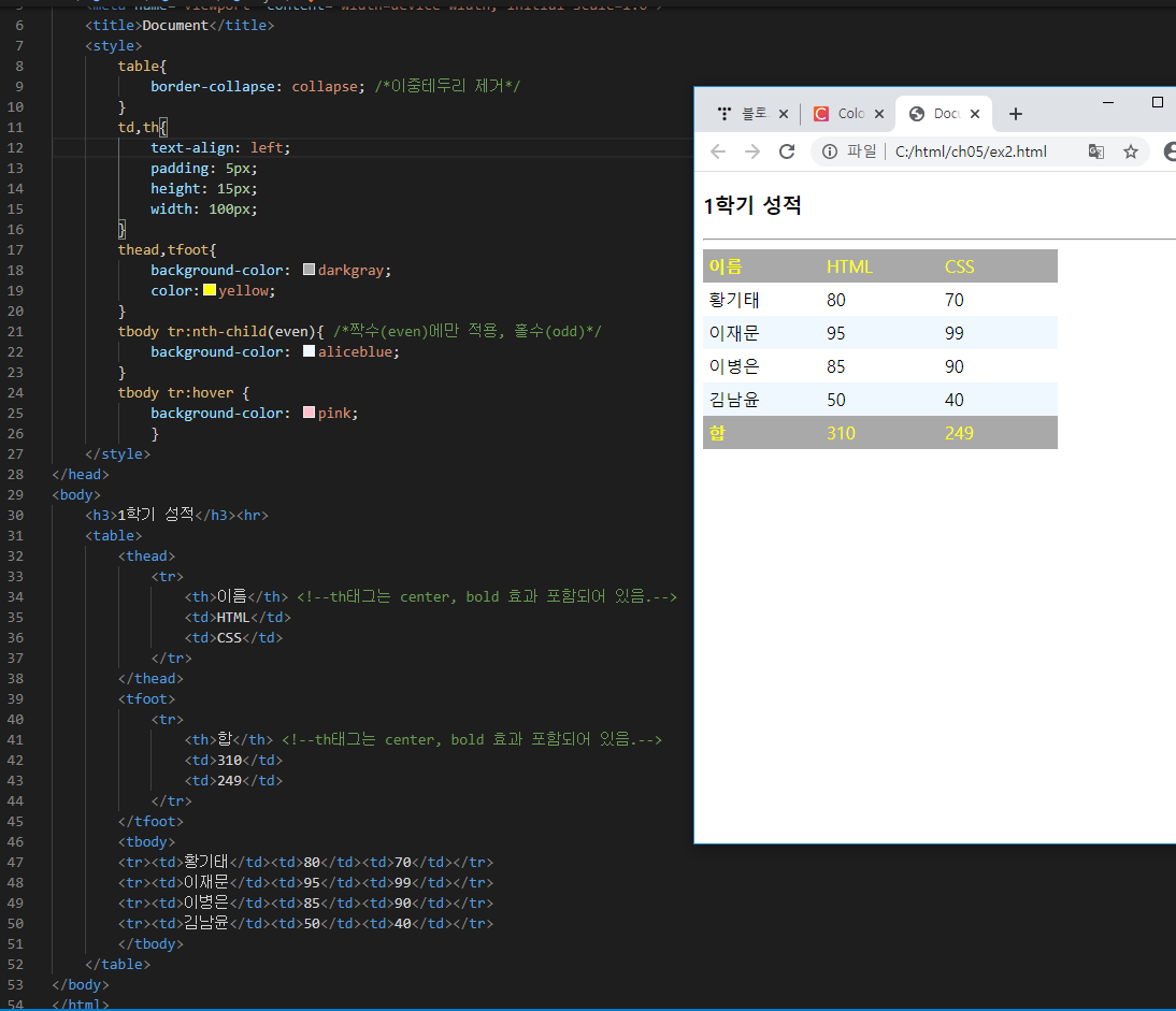 <th>합</th> <!--th태그는 center, bold 효과 포함되어 있음.-->