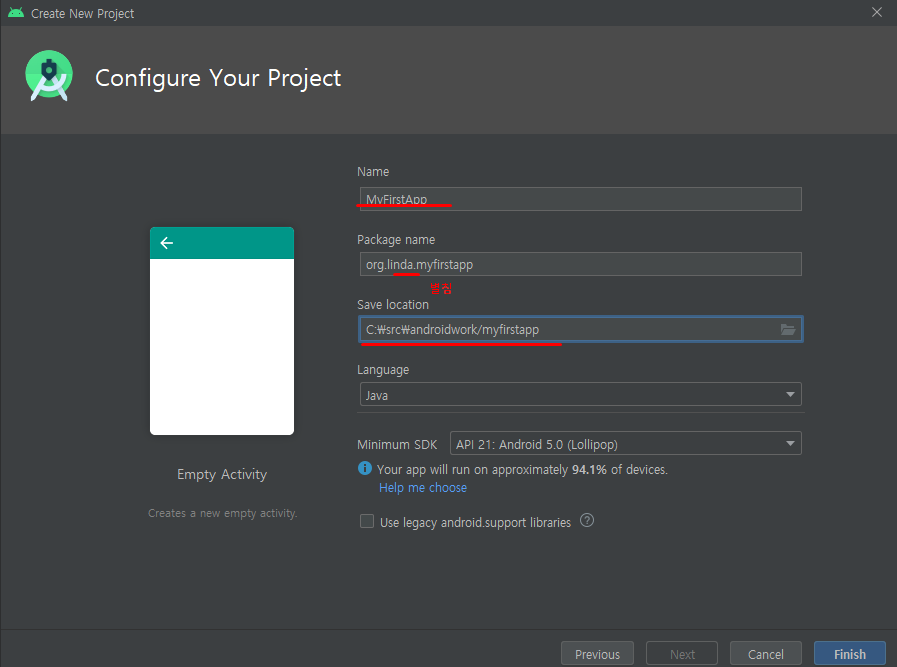 Minimum SDK는 회사마다 다르지만 여기서는 21로 설정한다.
