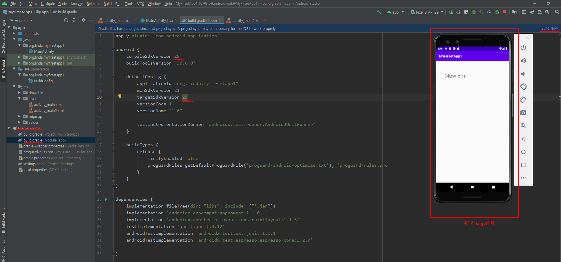 이렇게 이 파일을 수정해주고 나면 항상 sync now를 해주세요!