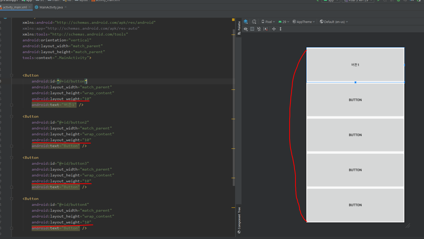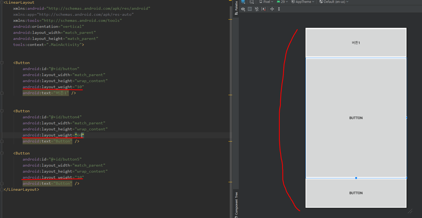 weight가 잡혀있으면 layout_width나 layout_height는 "0dp"를 줘야한다
