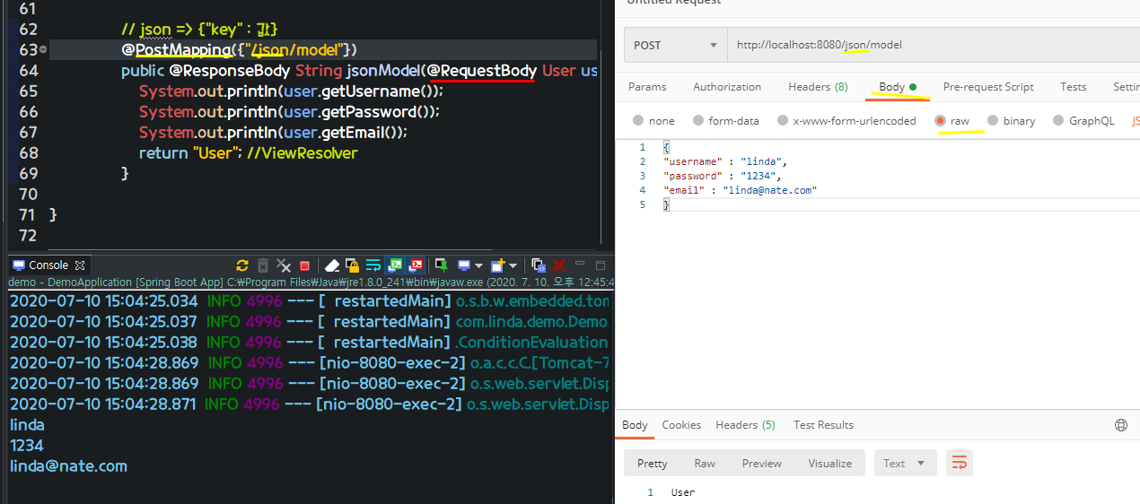 그래서 받을 때 request할때 get으로 select하려면 user 오브젝트를 DB에서 받아와서 return 할때 @ResponseBody 붙혀놓으면 json이 객체화 된 것을 리턴해줄수 있다. 그리고 문법은 " ". 다른 것도 리턴할 수 있다는 것...