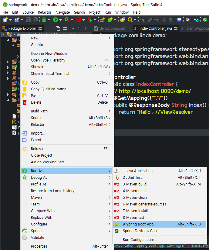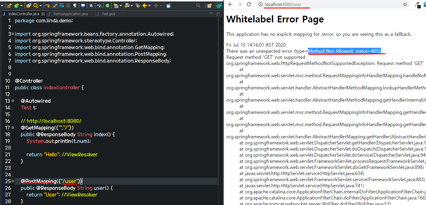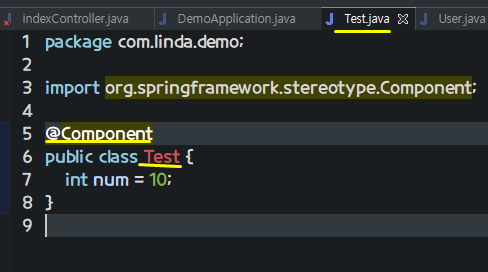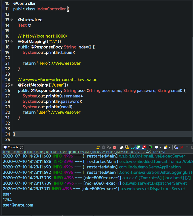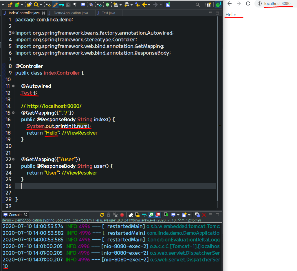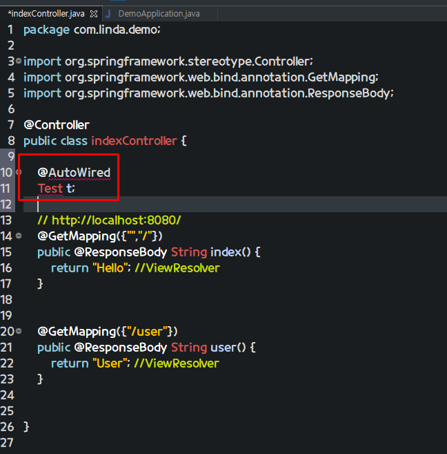 클래스 코드 윗줄에 @Controller적어서 컨텍스트에 등록시켜주면 된다. 그럼 jvm이 처음 만든 내 com.linda.demo 이하만 스캔할 때 이 클래스 파일을 스프링 컨텍스트 메모리에 띄워준다 = 등록해준다. (new해준다)