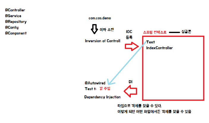 여기서 @AutoWired 로 찾고 있다. 이렇게 찾아 쓰는 것을 DI라고 한다.