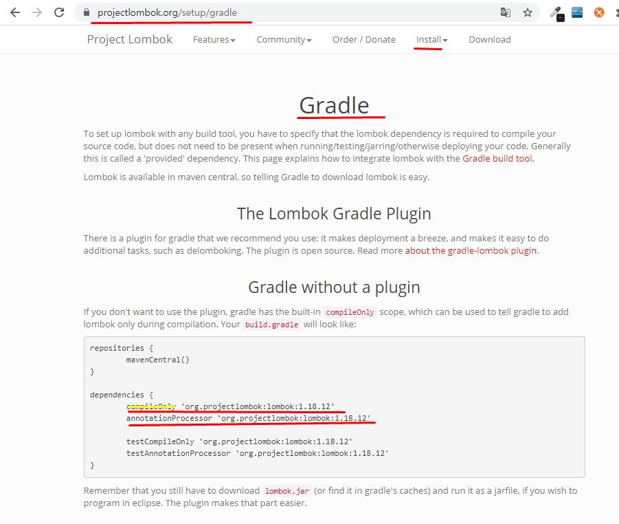 혹시 만약 안드로이드에 gradle에서 lombok을 다운받고 싶다면 lombok이라고 구글해서 아래와 같이 참고하여 어느 파일에 적어야 하는지 생각해서 할 수 있다!