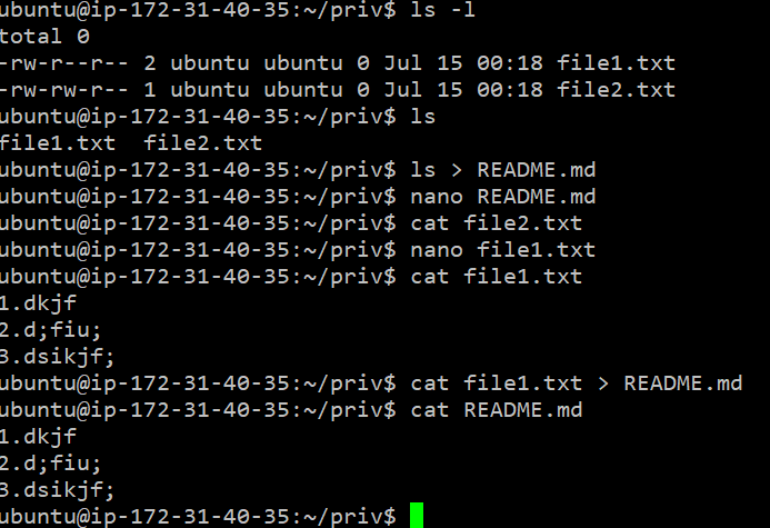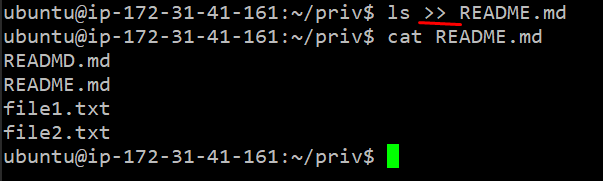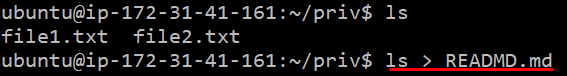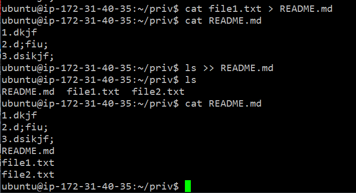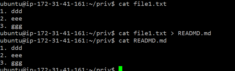 file1.txt를 README.md에 덮어씌워줘. 리다이렉션을 함.
