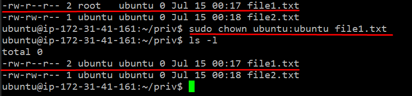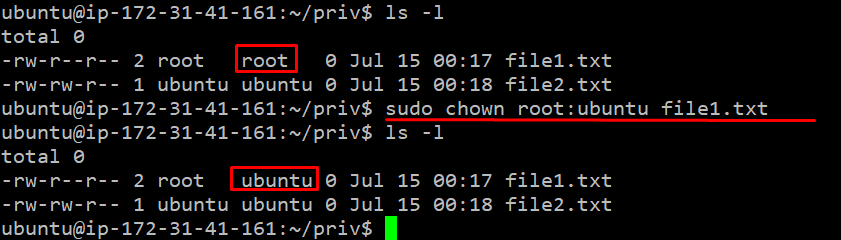 sudo chown root:ubuntu file1.txt 소유자 권한을 바꿈