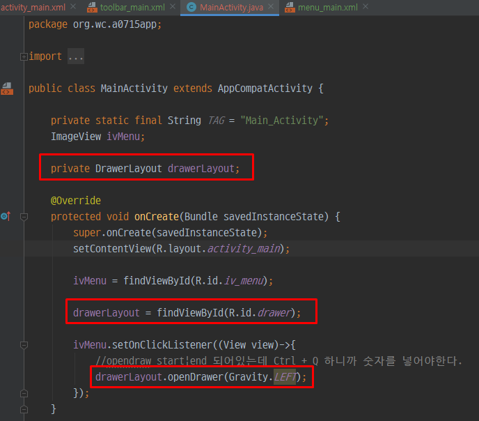 MainActivity에서 이렇게 적용하면 메뉴 버튼을 눌렀을때 반응한다.