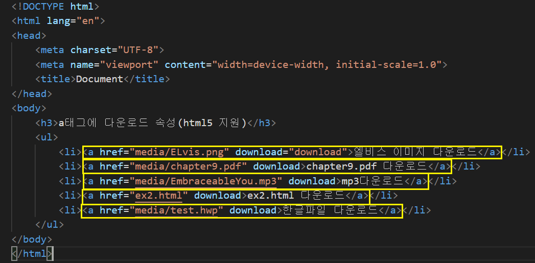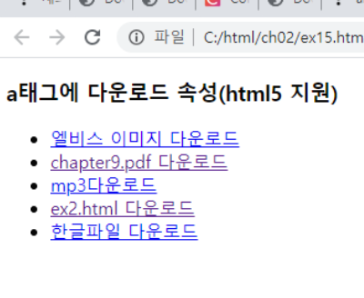 <li><a href="ex2.html" download>ex2.html 다운로드</a></li>