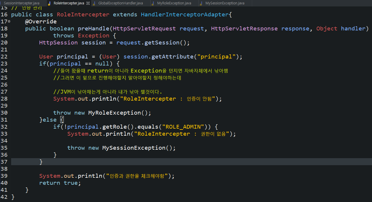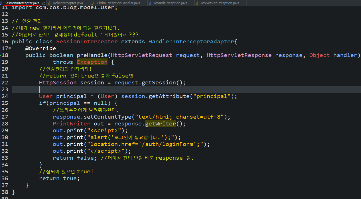 인증 안되어있으면 익셉션이 나타나게하고