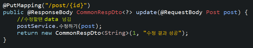RequestDto를 만들어서 데이터를 담고 id를 따로 받았으니