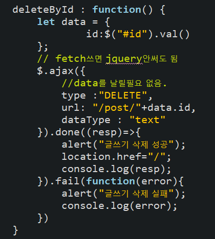 post.js에서 삭제버튼을 눌렀을때 작동하게 코드를 추가한다.