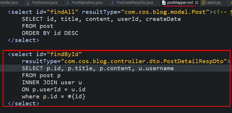 xml파일에서 아까 만들었던 SQL Join을 넣어둔다.