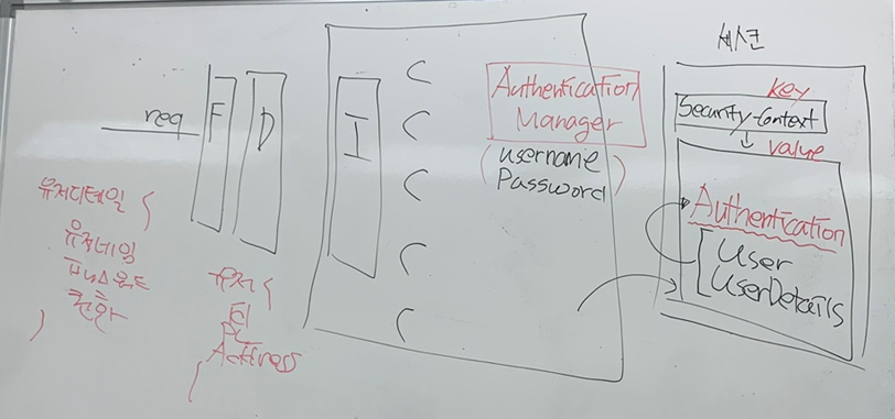 하지만 회사마다 다 다른 유저를 클래스들의 필드들이 있을 텐데 UserDetails에 컴포지션해서 만든다. 회사에서 필요한 클래스랑 Authentication Manager에 던지면 세션에 key Security-Context의 value로 Athentication객체를 만들어 User, UserDetails를 담아진다.