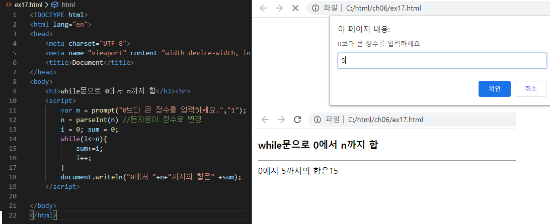 document.writeln("0에서 "+n+"까지의 합은" +sum);