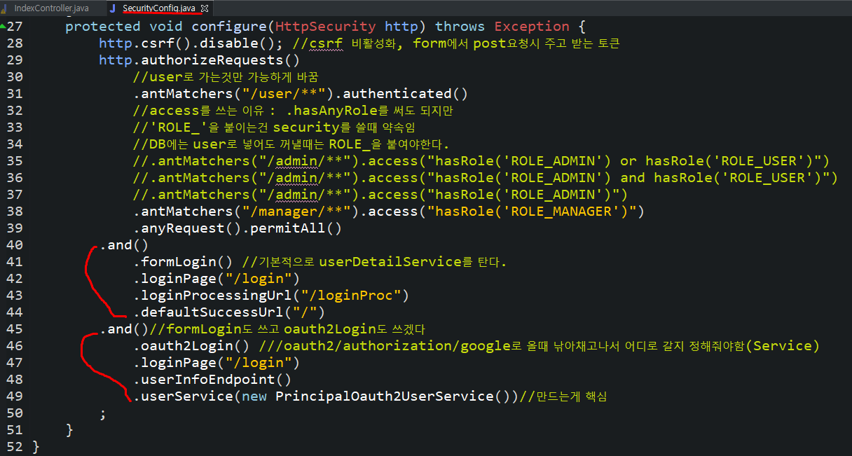 SecurityConfig에서 OAuth2.0을 사용해서 login 할때 설정을 적어준다.