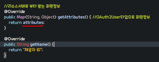 implements OAuth2User도 하고 나면 아래 두 함수를 오버라이드 해야한다.