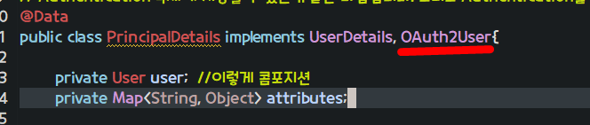 PrincipalDetail에 Oauth를 이용해서 로그인하고나면 받는 회원정보들을 저장한다.