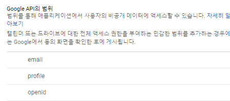 동의 화면 구성 눌러서 스코프 설정으로 이동