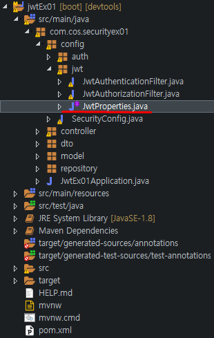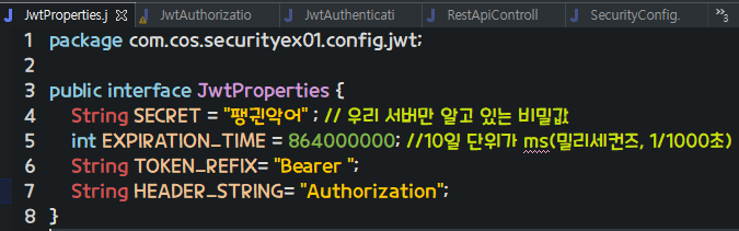 필터들 구현하면서 실수 할 수 있으니까 인터페이스로 JwtProperties를 만든다.