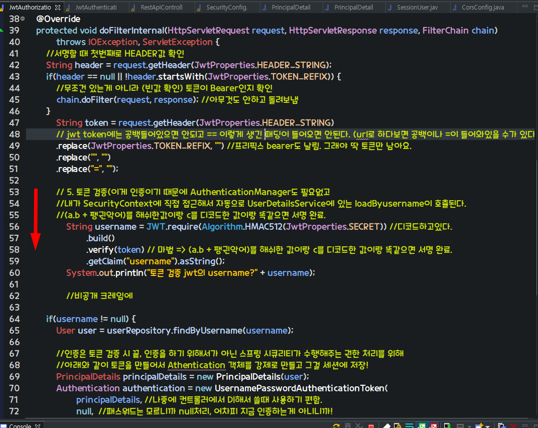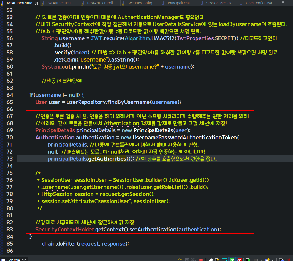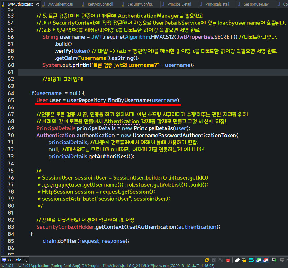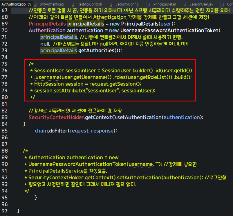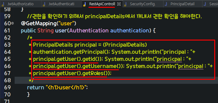 하지만 주석 처리한 이유는 우리는 세션에 객체 저장하고 꺼내쓰지 않고 Authentication객체에서 영속성이 있는 유저객체에서 데이터를 아래와 같이 쓸 수 있다!