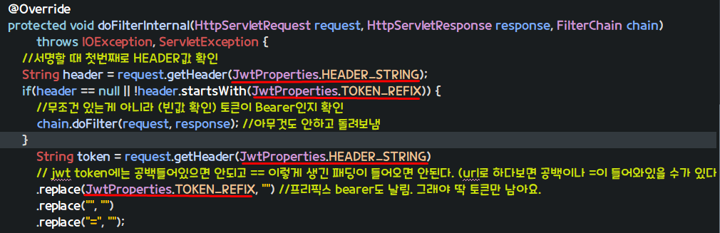 .replace(JwtProperties.TOKEN_REFIX, "") //프리픽스 bearer도 날림. 그래야 딱 토큰만 남아요.