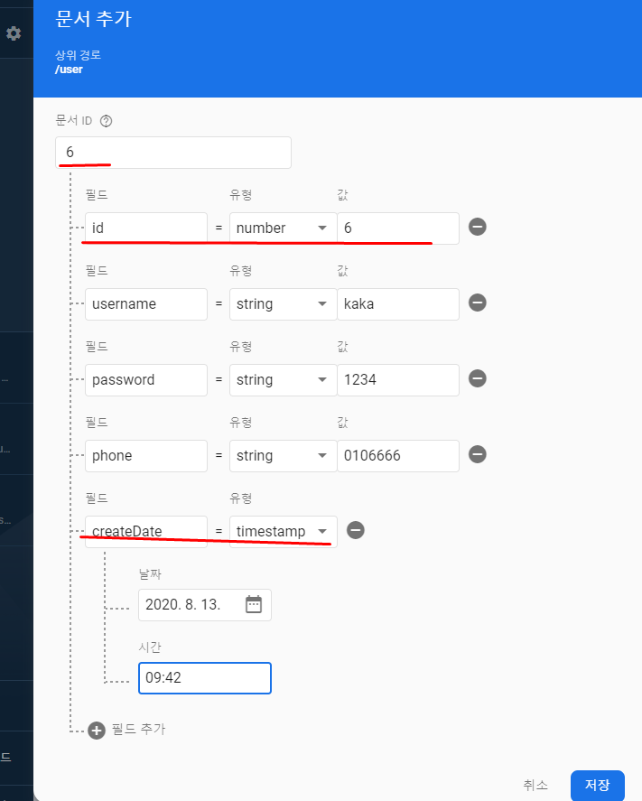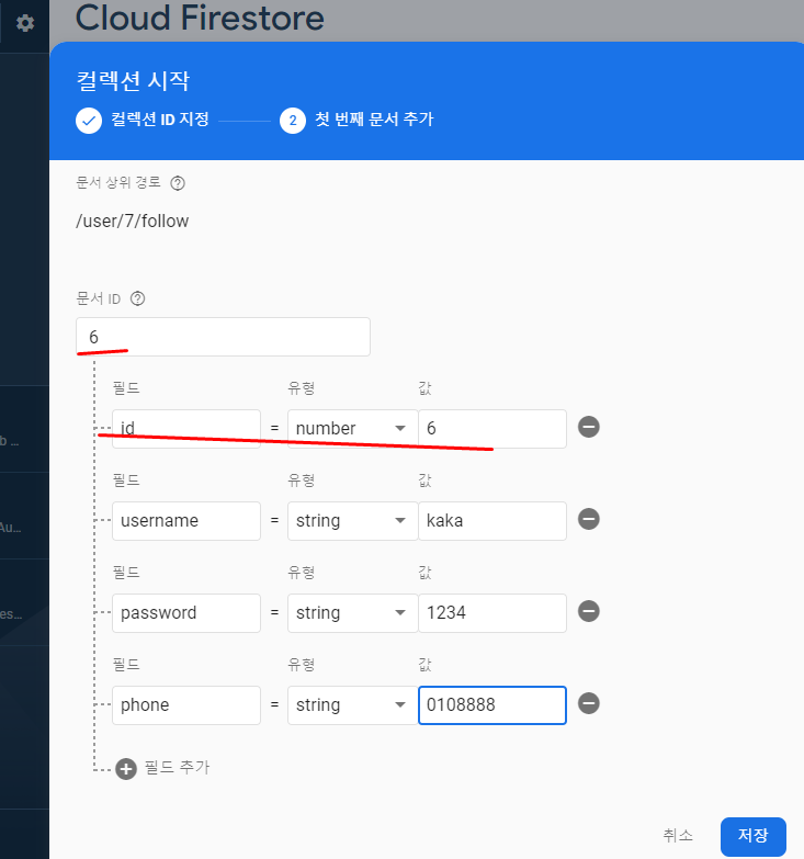 이 UID로 컬렉션에 문서 ID값으로 해서 문서 만들기