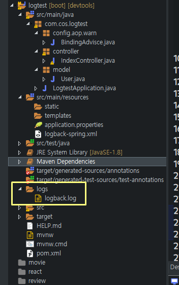 loback.log파일에 logback-spring.xml에서 설정한 로그 레벨에 오류들이 표시된다.