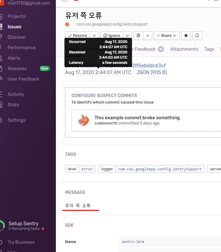 회사밖에서는 센트리로 보내진 요약된 오류 메세지를 보면 된다.
