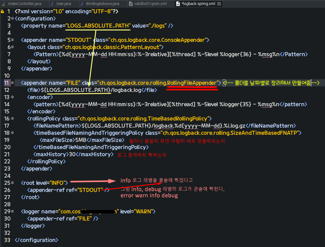 <appender name="FILE" class="ch.qos.logback.core.rolling.RollingFileAppender"> <!-- 폴더를 날짜별로 정리해서 파일명 계속 바뀌면서 만들어줌-->
