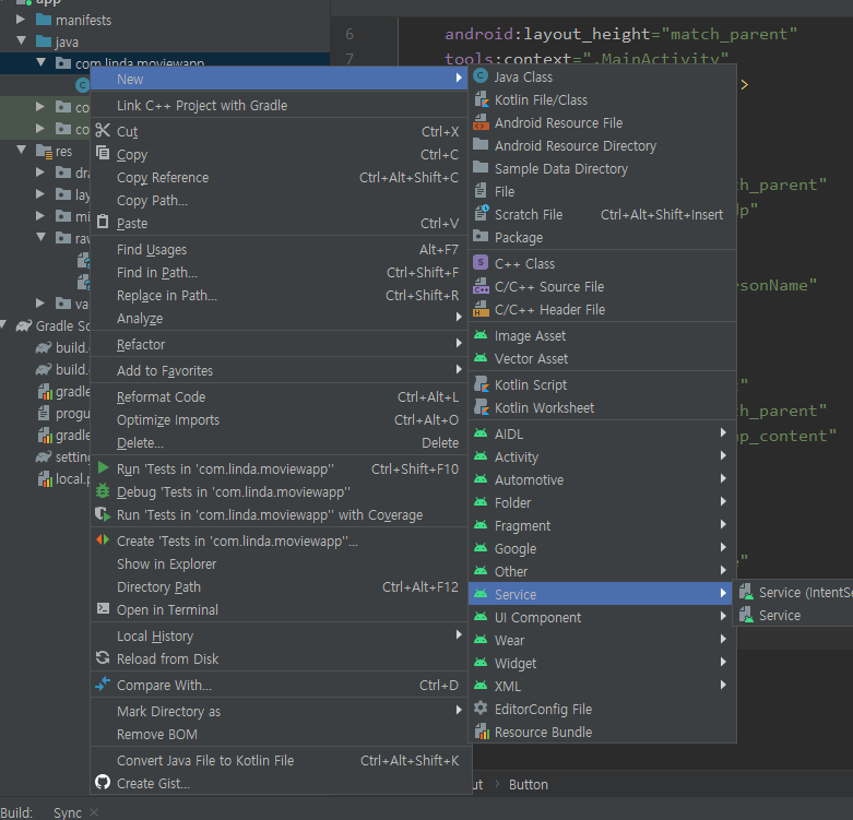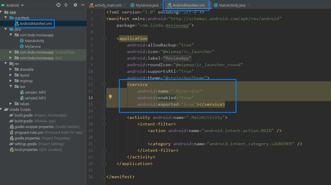이렇게 service를 만들면 아래와 같이 AndroidManifest에 등록이 된다.