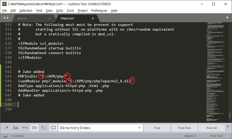 이제 apache설정을 다시 수정해야한다. C:/APM/Apache24/conf의 httpd.conf를 열고 다음과 같이 수정한다.