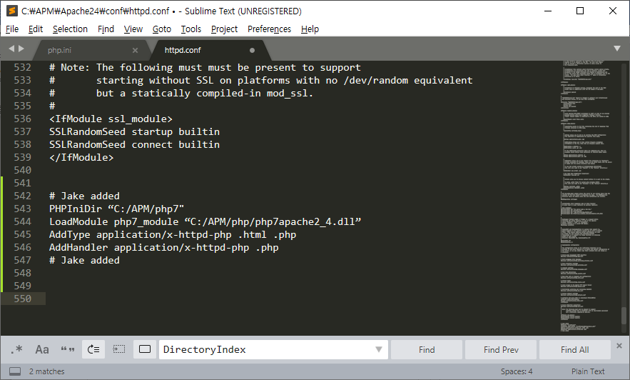 이제 apache설정을 다시 수정해야한다. C:/APM/Apache24/conf의 httpd.conf를 열고 다음과 같이 수정한다.
