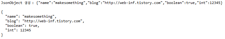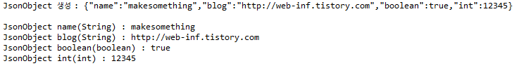 System.out.println("JsonObject 생성 : " + jsonObject.toString() + "\n");