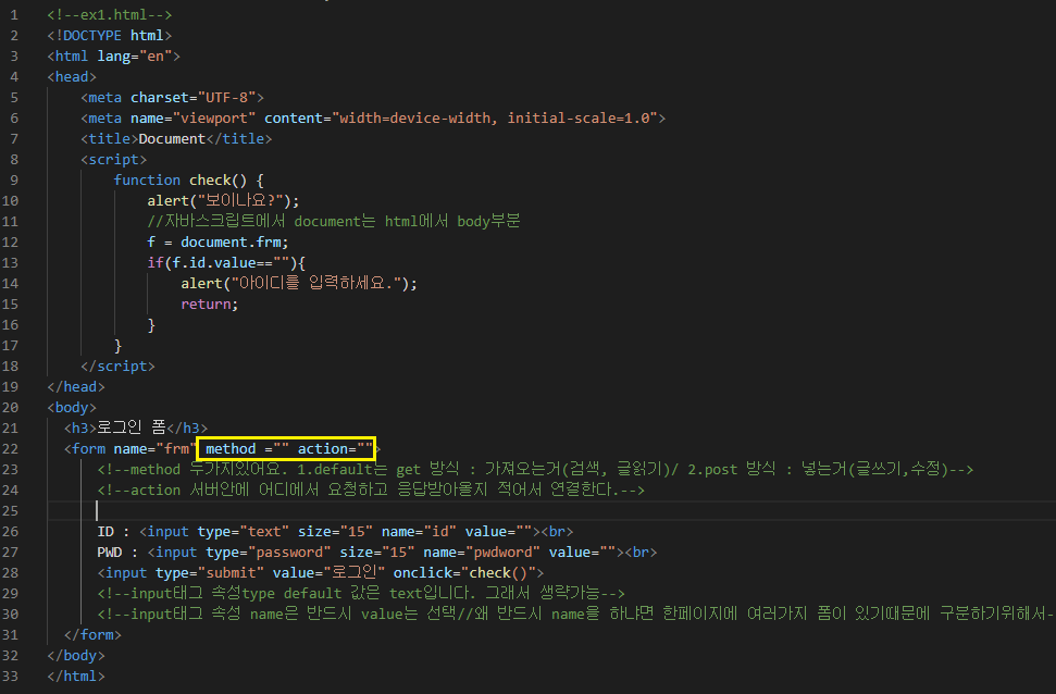 아래와 같이 <form method="" action=""> 를 알아보기 위한 연습!