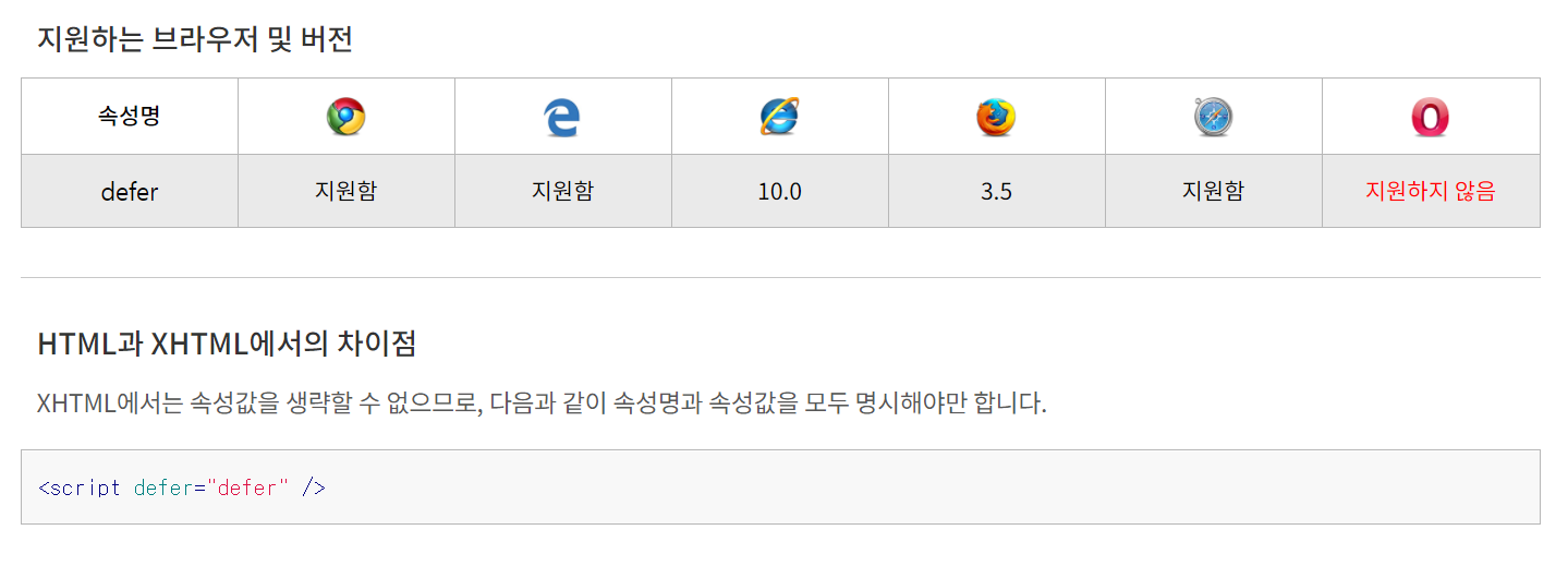 - async 속성은 명시되어 있지 않고 defer 속성만 명시된 경우 : 브라우저가 페이지의 파싱을 모두 끝내면 스크립트가 실행됨.